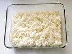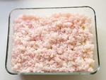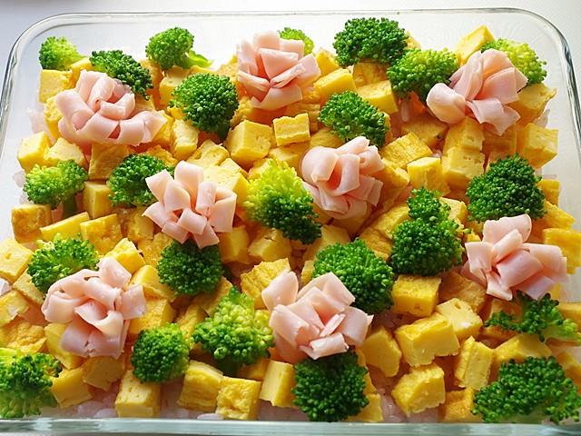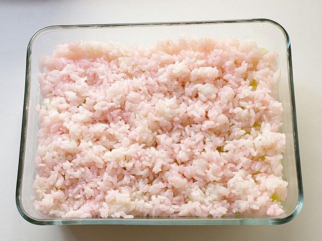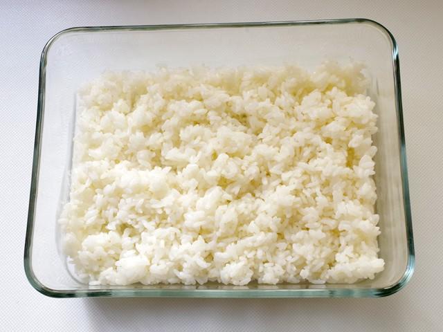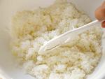 ご飯...大き目のボウルに入れ、あらかじめ混ぜ合わておいたすし酢を回しかけ、ご飯を切るように混ぜ合わせて粗熱が取れたらぬれぶきんをかける。