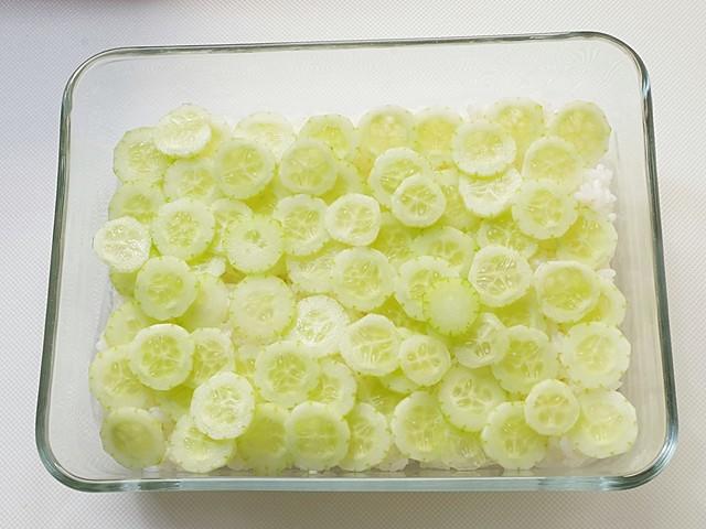 - ・横から見たり分けたりしたときに、中のきゅうりの緑やでんぶの桜色も楽しめます♪