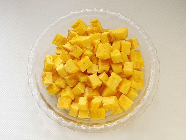 卵...ボウルに卵を割り入れ、砂糖を加えてしっかり混ぜ合わせ、サラダ油を入れた玉子焼き器に流し入れて中火で加熱し、周りが固まってきたら裏返ししてさらに焼き、さいの目に切る。