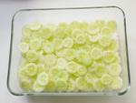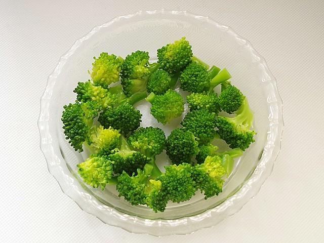 ブロッコリー...鍋に水と塩を入れて沸騰させたらブロッコリーを入れ、約1分ゆでて湯切りしたら小指の先の大きさ程度に切り分ける。