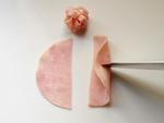 ハム...2等分に切って輪になるように軽く折り、画像を参照に5mm間隔に8mm程度の長さで切り込みを入れ、くるくる巻く。
