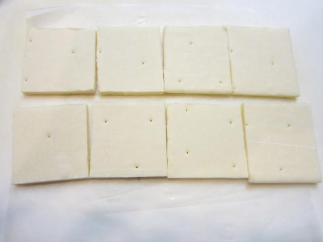 - 冷凍パイシート...冷蔵庫に移して、取り扱いしやすい状態になるまで10~15分程度置いて出し、4cm角程度に切り分ける。
