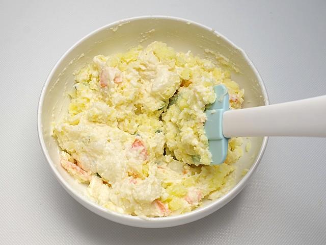 - じゃがいも...水にくぐらせラップで包み電子レンジ(600W)で2分30秒~3分加熱して皮をむき、潰す。