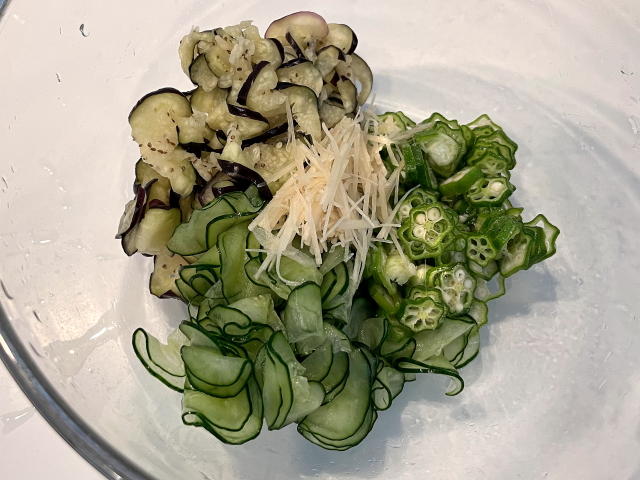 - オクラ...塩を振ってまな板の上で転がし、洗ってヘタの周りを切り取って薄切りにする。