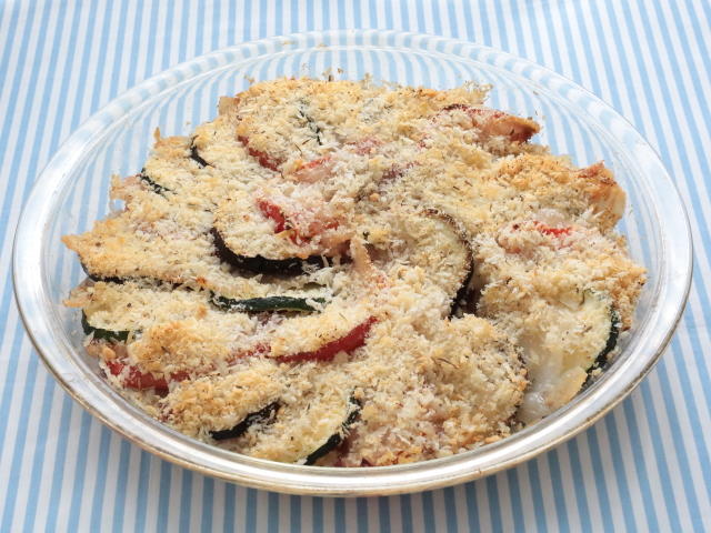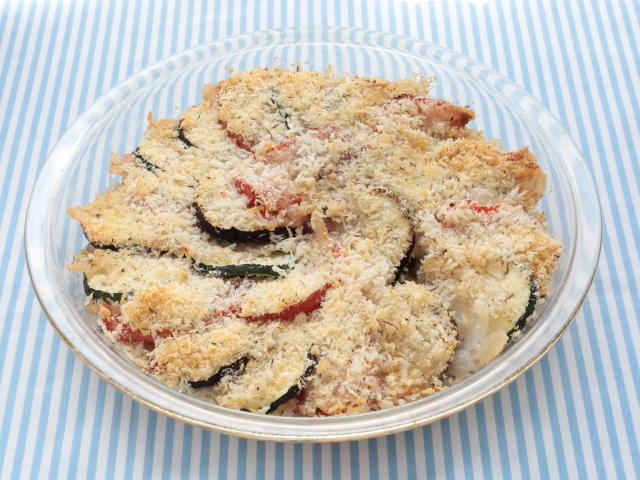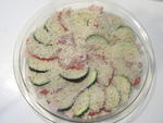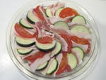 - ズッキーニ・・・ヘタを切り落として7mm程度の輪切りにし、塩少々を振って1分程度おいた後、軽く洗って水気を切る。