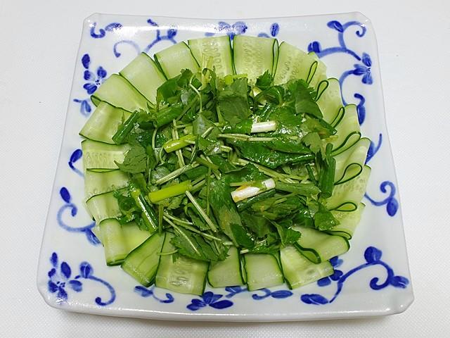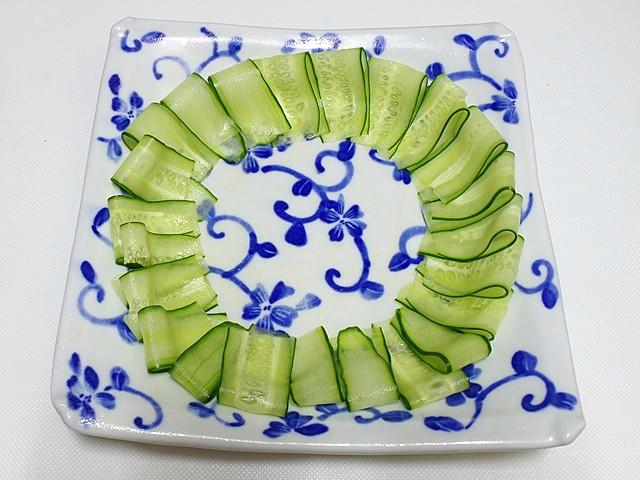 - きゅうり...2等分に切ってスライサーで薄くスライスする。