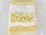 - さつまいも...水にくぐらせ、ラップに包んで電子レンジ(600W)で約1分加熱し、皮をむいて5mm角程度に切る。