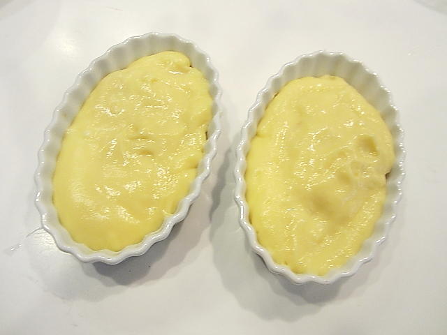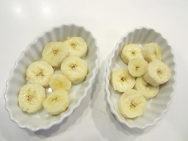 3.耐熱皿にバナナを2等分してそれぞれ並べ、2をそれぞれに入れる。