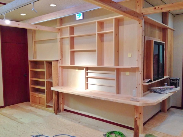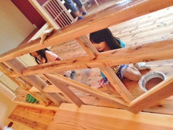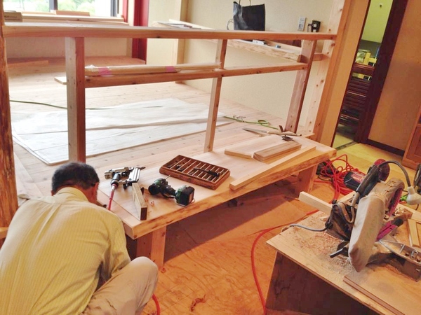 床を木で貼り、小上がりができ、木の柱が組まれて......