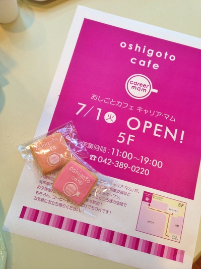 開業の記念として、カフェプロジェクトのメンバーでもあるパティシエ・大石智保さんに頼み、おしごとカフェのオリジナル「おしごとカフェ キャリア・マム ロゴ入りアイシングクッキー」を作成しました。